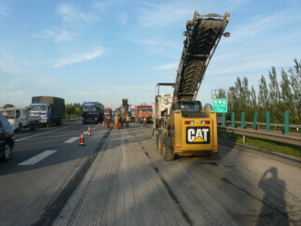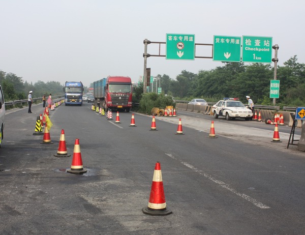 第二、要對(duì)施工過程中的實(shí)際工程數(shù)量、各工序之間的銜接點(diǎn)、工程的難點(diǎn)、工程進(jìn)度等與車輛有序通行可能產(chǎn)生的矛盾做好充分的準(zhǔn)備。對(duì)于本項(xiàng)目,主要問題有三個(gè):其一是由于該路段交通量太大,所以無論是挖補(bǔ)工程還是罩面工程,都必須是白天安排施工作業(yè),夜間則要恢復(fù)道路雙向四車道通行;其二是出京方向K69--K98段無任何分流路線,需要考慮周密的交通管理措施;其三是通過實(shí)驗(yàn)和數(shù)據(jù)收集,準(zhǔn)確預(yù)判各類狀況,及早采取措施,避免各類意外情況發(fā)生。為切實(shí)做好本項(xiàng)工程,我們?cè)?span lang="EN-US">2009年10月、2010年10月和2011年7月在不同路段分別進(jìn)行了三次試驗(yàn)性施工。通過試驗(yàn)我們摸清了如下情況:1、正常通行時(shí)單車道能夠通過的最大交通量;2、施工過程中組織好車輛的有序通行至關(guān)重要,倘若有一輛車通行不暢進(jìn)而造成堵點(diǎn)就需要立即疏導(dǎo),否則就會(huì)迅速形成長(zhǎng)距離大面積的擁堵;3、壓車超過一定數(shù)量時(shí)需要暫停施工放行。通過模擬施工,我們制定了切合實(shí)際的應(yīng)急預(yù)案,為施工時(shí)及時(shí)有效地處置突發(fā)事件提供了極大地幫助。