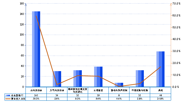 列入統(tǒng)計(jì)范圍的企業(yè)主要分布于水污染防治、大氣污染防治、固體廢物處理處置與資源化等七個(gè)細(xì)分領(lǐng)域,其中,從事水污染防治的企業(yè)數(shù)量占比72.5%,貢獻(xiàn)了五成以上的環(huán)保業(yè)務(wù)收入。