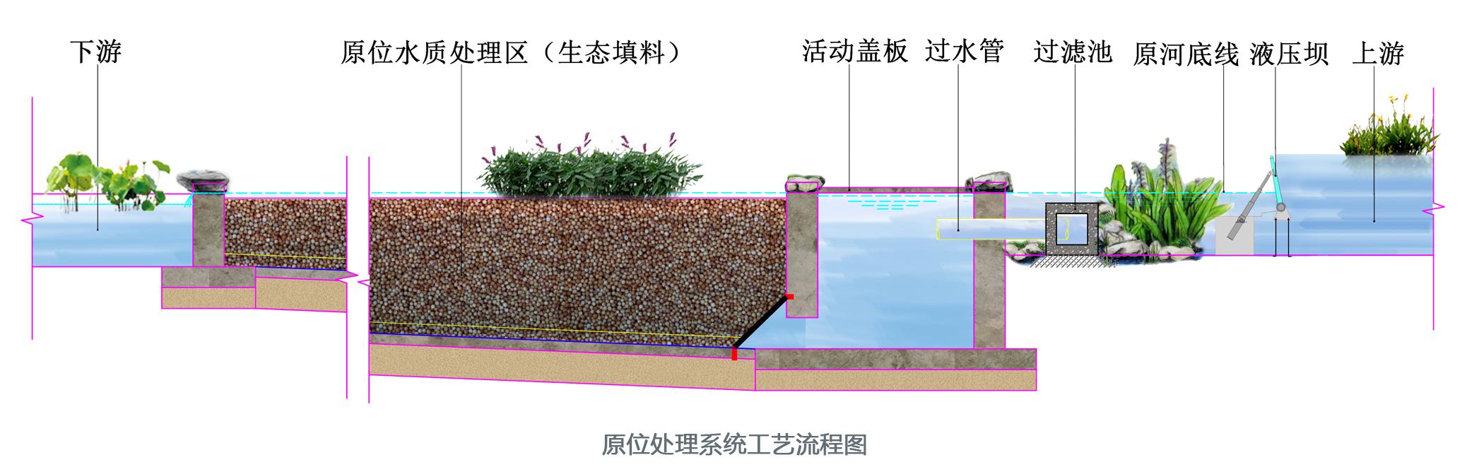 主要利用河道的河床,在河床下建設(shè)處理單元。在不降低行洪標(biāo)準(zhǔn)的前提下,通過自動(dòng)控制的壩體調(diào)整河道水位高差,將污染水引入水下處理單元,采用具有針對(duì)性的脫氮除磷強(qiáng)化填料做基質(zhì),對(duì)水質(zhì)進(jìn)行凈化。用于周邊土地資源緊張的城市河道治理。