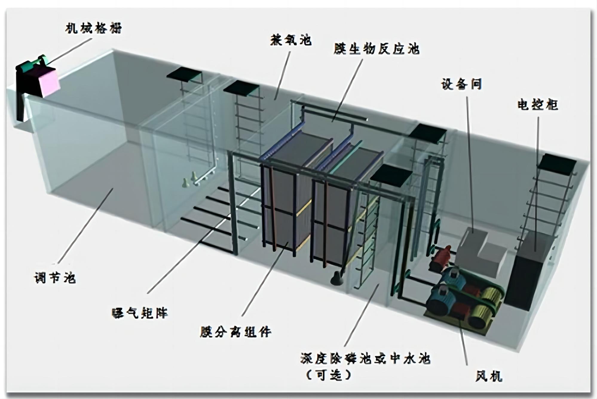 工藝原理:膜生物反應(yīng)器(MBR)工藝主要由兼氧池、MBR膜生物反應(yīng)池、深度除磷池等部分組成。通過好氧、厭氧菌的分解作用、中空纖維膜的截留作用、強化除磷填料的吸附作用等實現(xiàn)中水回用或達(dá)標(biāo)排放。