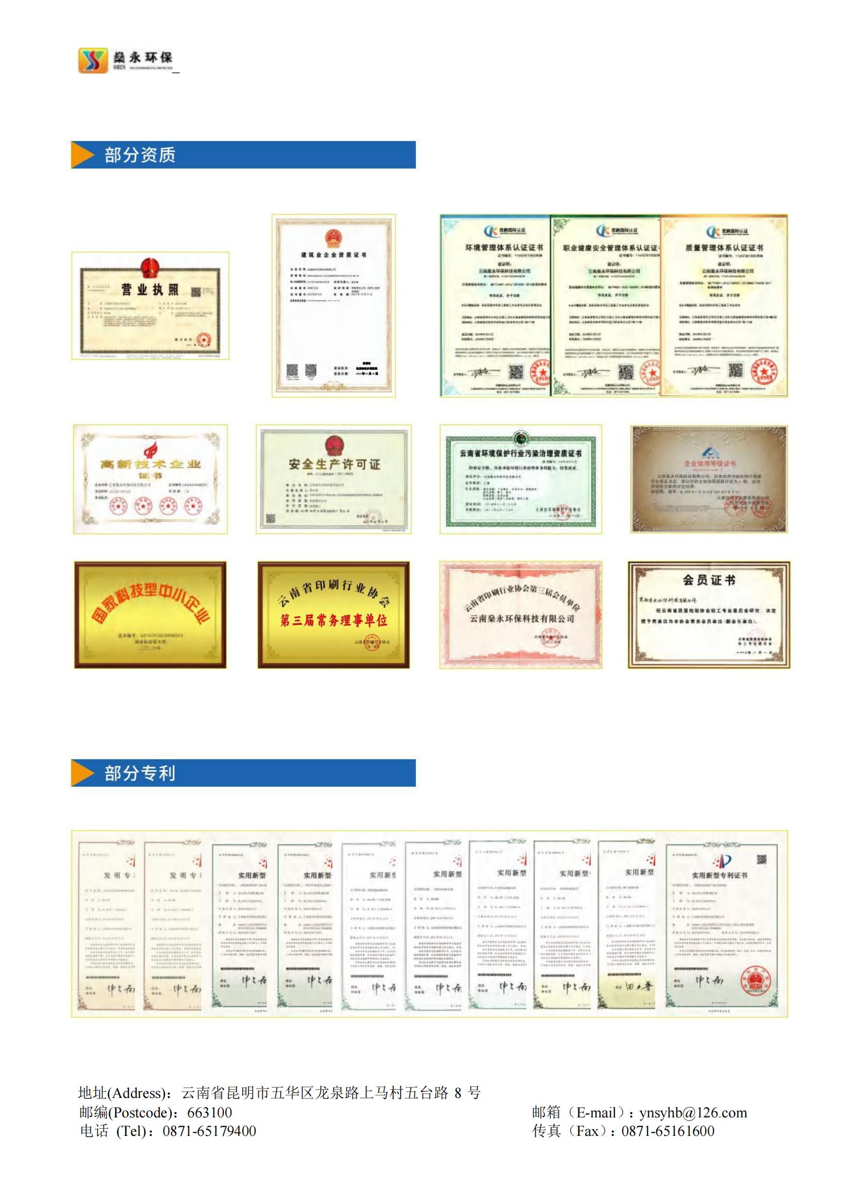 燊永公司堅持“創(chuàng)新、協(xié)作、共贏”的價值觀,以“專業(yè)、專心、專注”為服務理念,以“求實、求是、求精”為質量宗旨,為客戶提供優(yōu)質、高效、貼心的服務。公司獲得國家專業(yè)部門頒發(fā)的《環(huán)境工程專業(yè)承包三級》資質、《污染治理乙級》資質、《企業(yè)信用等級A級》證書、《云南省科技型中小企業(yè)》認定證書、《ISO9001/GBT50430質量管理體系》證書、《ISO14001環(huán)境管理體系》證書、《ISO45001職業(yè)健康安全管理體系》證書等多項榮譽和多項的專利技術。
