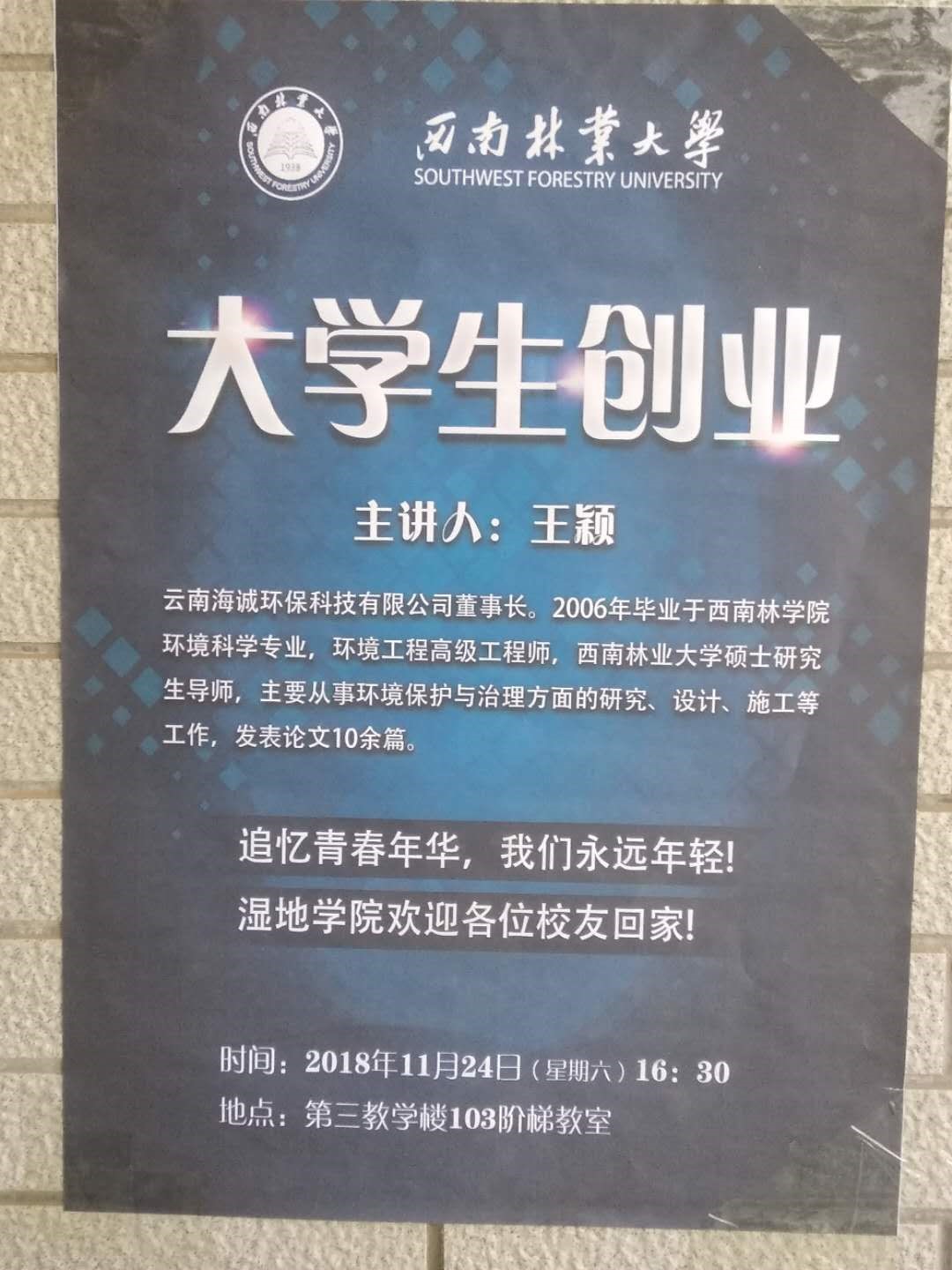 公司總經(jīng)理王穎被西南林業(yè)大學(xué)聘為碩士研究生導(dǎo)師暨受邀于西南林業(yè)大學(xué)80周年慶“大學(xué)生創(chuàng)業(yè)”活動(dòng)主題的主講人