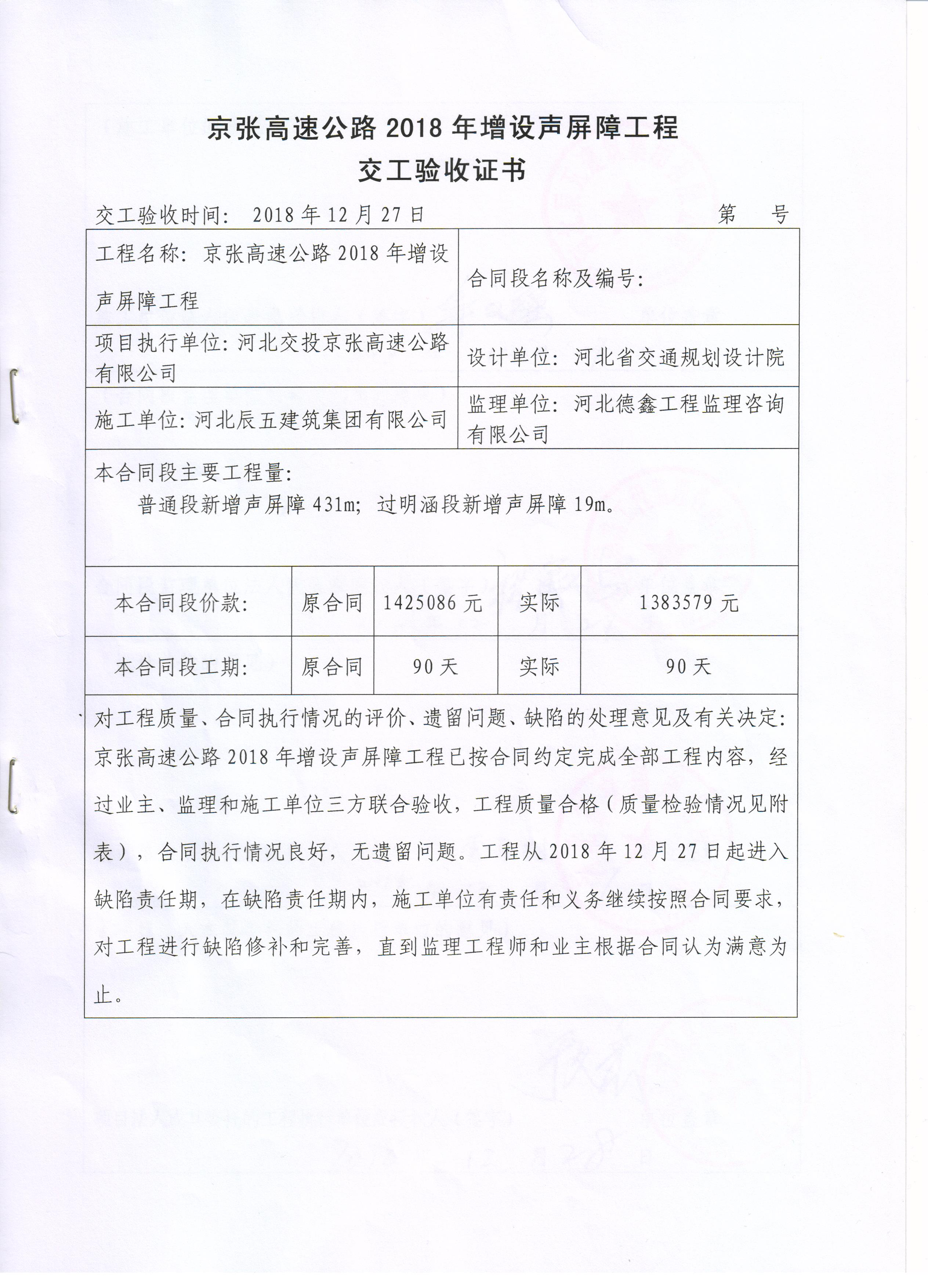 京張高速公路2018年增設(shè)聲屏障工程交工驗(yàn)收證書(shū)
