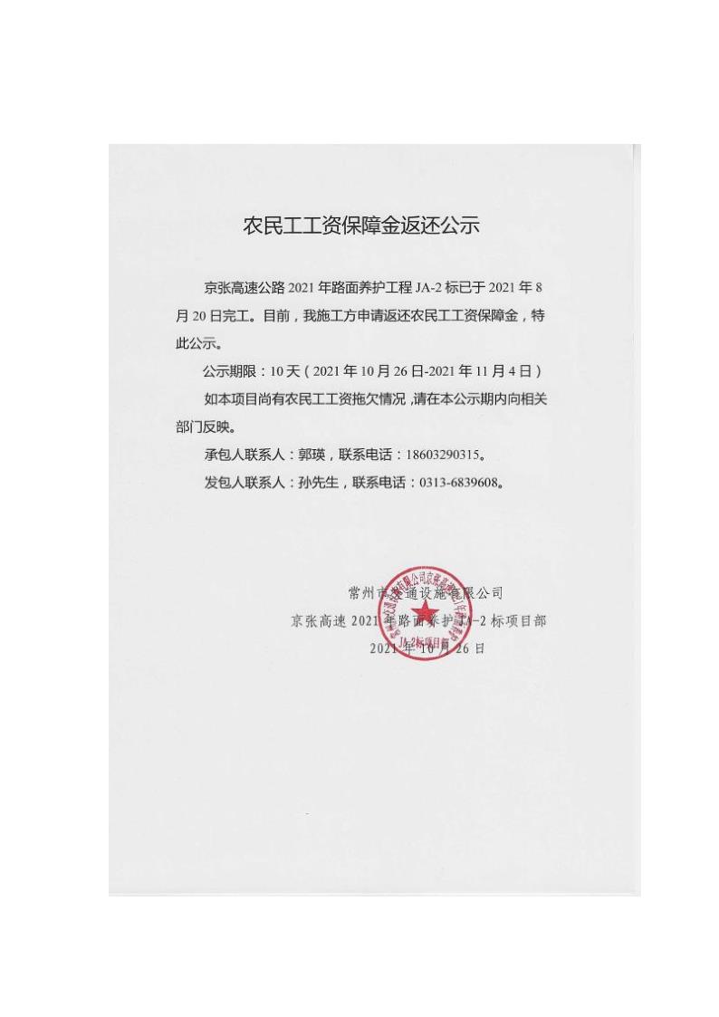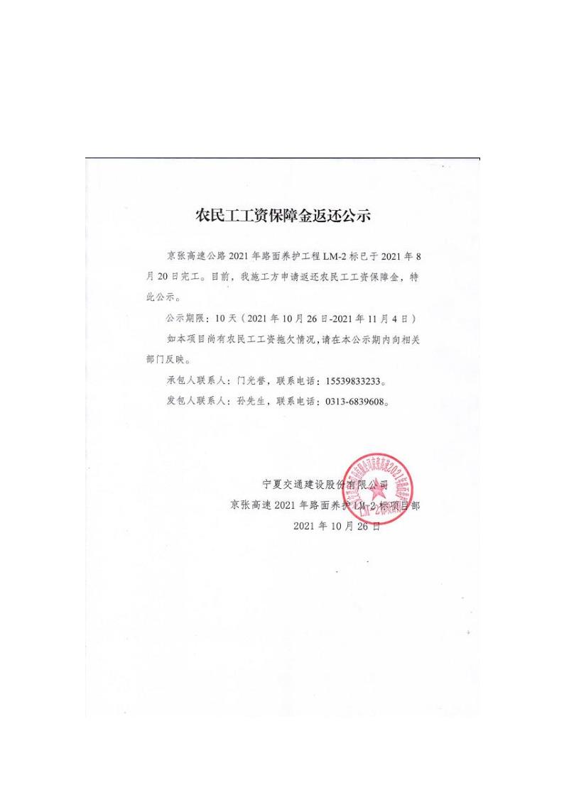 2021年路面養(yǎng)護工程農(nóng)民工工資保障金返還公示